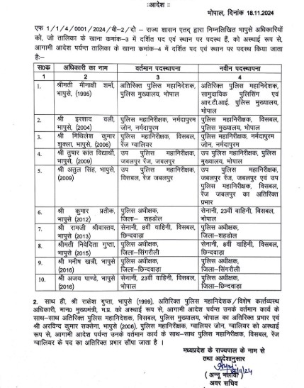 मध्य प्रदेश में प्रदेश सरकार ने एक बार फिर 10 IPS अफसर बदल दिए हैं। लिस्ट के मुताबिक 2016 बैच के IPS अफसर अजय पांडे छिंदवाड़ा SP बनाए गए हैं। वहीं मनीष खत्री को अब सिंगरौली जिले की कमान सौंपी गई है। मीनाक्षी शर्मा सामुदायिक पुलिसिंग एवं आरटीआई पुलिस मुख्यालय एडीजी बनाई गईं हैं। IG नर्मदापुरम इरशाद वली को IG विशेष सशस्त्र पुलिस बल बनाए गए हैं।  IG विशेष सशस्त्र पुलिस बल ग्वालियर मिथिलेश कुमार शुक्ला अब होशंगाबाद IG की जिम्मेदारी निभाएंगे। जबलपुर रेंज DIG तुषार कांत विद्यार्थी मुख्यालय भेज दिए गए हैं। शहडोल SP कुमार प्रतीक को 23वीं बटालियन का कमांडेंट बनाया गया है। 8वीं बटालियन के कमांडेंट रामजी श्रीवास्तव को शहडोल का एसपी बनाया गया है। सिंगरौली SP निवेदिता गुप्ता को 8वीं बटालियन का कमांडेंट बनाया गया है।